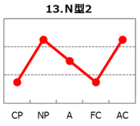 N型2は、NP(優しさ)とA(論理性)が高め、AC(協調性)も高めで、CP(厳しさ)とFC(自由度)が低めに出やすい波形です。患者・家族の気持ちに寄り添いながら、診療方針は根拠に基づいて丁寧に組み立てる「慎重で堅実」なタイプ。周囲と歩調を合わせ、合意形成を作りつつ、準備を重ねて安全に成果を積み上げます。一方で自由度が低めのため変更や例外が続くと消耗しやすく、父性が低めだと決断が遅れがちになります。強みを最大化する鍵は、判断の締切を先に決め、確認の上限ルールで慎重さを“前進のエンジン”に変えることです。