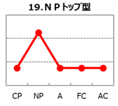 NPトップ型は、NP(優しさ)が非常に高く、CP(厳しさ)・A(論理性)・FC(自由度)・AC(協調性が低めに出やすい波形です。患者・家族・スタッフの感情を受け止め、安心感を提供する力が突出しており、信頼関係の構築が速いタイプです。特に不安や恐怖、葛藤が強い場面で“心の安全基地”として機能し、治療継続やチームの結束に大きく貢献します。一方で、厳しさが低めな分、線引きや決断が遅れがちで、実務が積み上がると抱え込みやすい傾向があります。