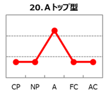 Aトップ型は、A(論理性)が非常に高く、CP(厳しさ)・NP(優しさ)・FC(自由度)・AC(協調性)が低めに出やすい波形です。事実と根拠を重視し、診断推論・治療方針・運用改善を合理で組み立てる「効率と精度」の人。ムダを嫌い、最短で成果が出る設計を作れるため、現場の生産性と安全性を同時に引き上げやすいタイプです。一方で共感表現が薄く、合意形成を省略すると「冷たい」「独断的」と受け取られ、反発や孤立が起きやすい点が課題。強みを最大化する鍵は、説明と共有を短文化し、感情面のクッションを“型”として持つことです。