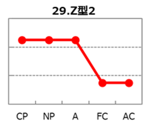 Z型2は、CP(厳しさ)とNP(優しさ)が高く、A(論理性)も高め、FC(自由度)が低め、AC(協調性)が低めに出やすい波形です。「守るべき基準」と「守るべき人」をはっきり持ち、責任感と共感で高いコミットを発揮します。Z型1より論理性が効きやすく、根拠と手順で支援を組み立てられるため、再現性の高い運用に強い一方、自由度が低めなので急な変更や例外に弱く、協調性が低めだと根回しや共有を省略して独断に見えやすい点が課題です。強みを最大化する鍵は、例外ルールと承認ルートを先に整備し、決定事項を短文化して“ついて来られる速度”に合わせることです。